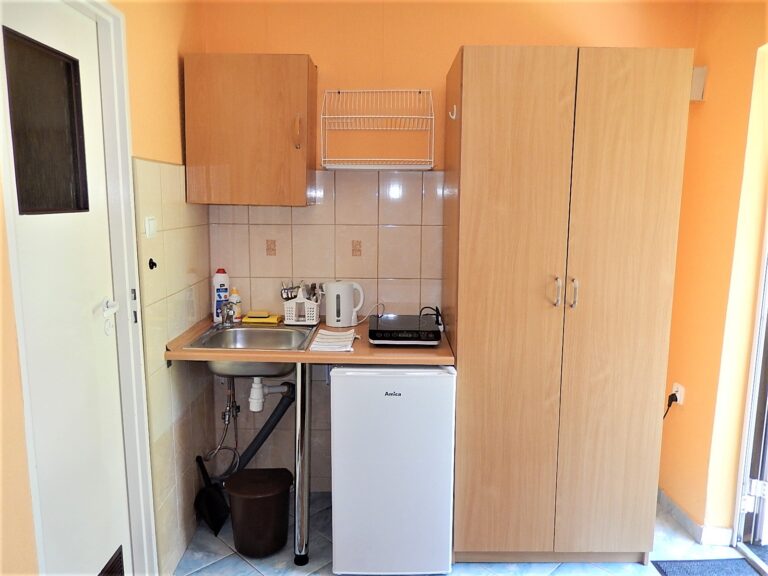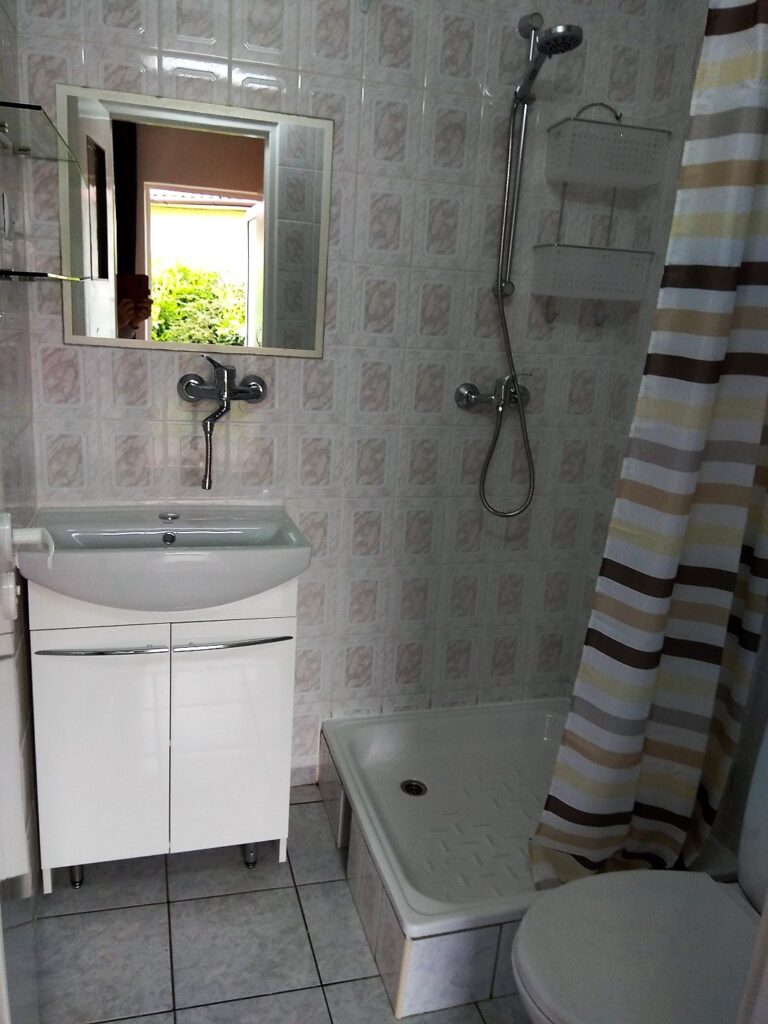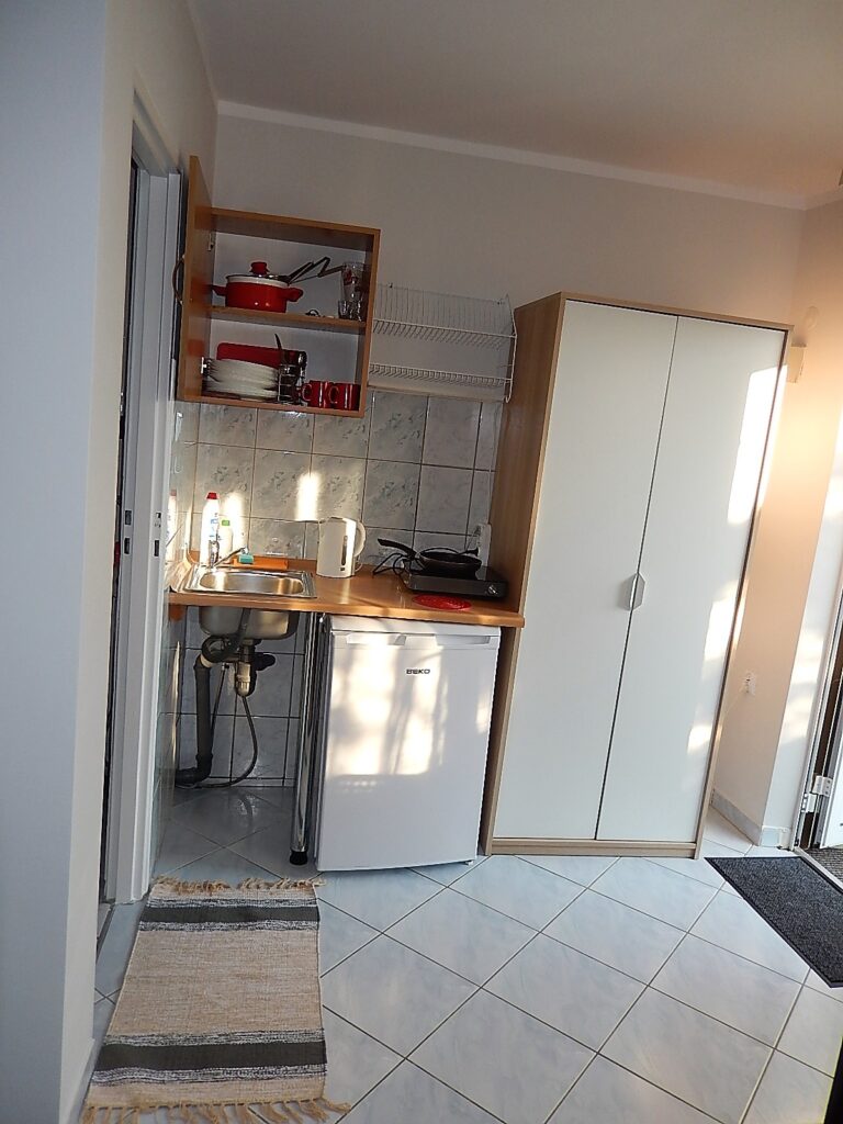 Wszystkie domki wyposażone są w łazienkę składającą się z prysznica, umywalki, WC i własnego, 60 litrowego elektrycznego ogrzewacza ciepłej wody. Każdy domek tej wielkości posiada niewielki aneks kuchenny z lodówką (bez zamrażalnika), zlewem jednokomorowym, czajnikiem elektrycznym, jednopalnikową kuchenką indukcyjną do gotowania i podstawowymi naczyniami kuchennymi (talerzyki, kubki, sztućce, garnek i patelnia). Aneks kuchenny jest przeznaczony do przygotowania prostych posiłków takich jak śniadania i kolacje.